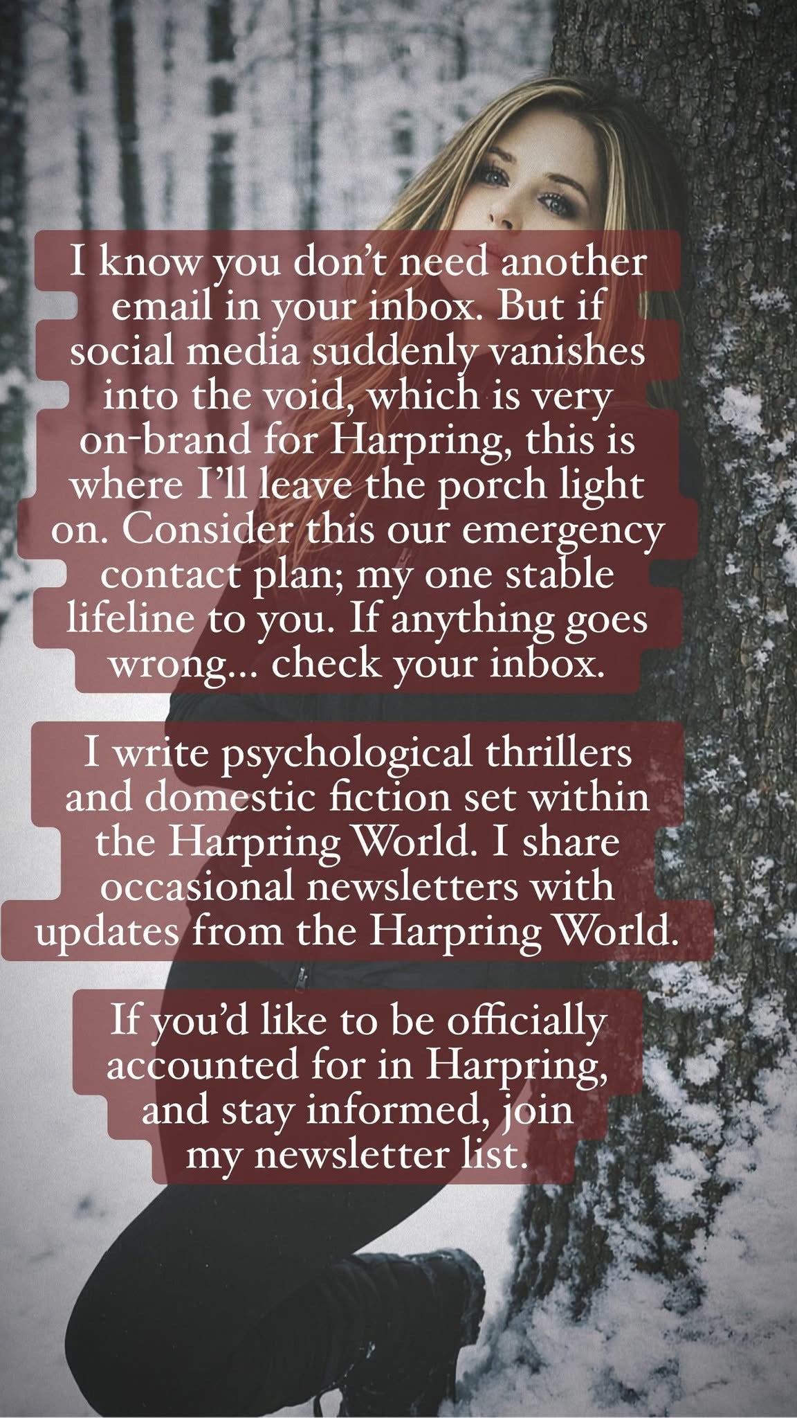 Anyway. A stranger is on their way to Harpring. The town just doesn’t know it yet. The suitcase is open on the bed. It’s been sitting there longer than expected. They keep folding the same article of clothing as if it might change something. Packing for Harpring feels different than packing for anywhere else. They check the address again, even though they know it by heart.